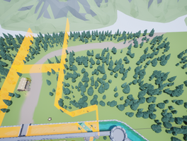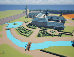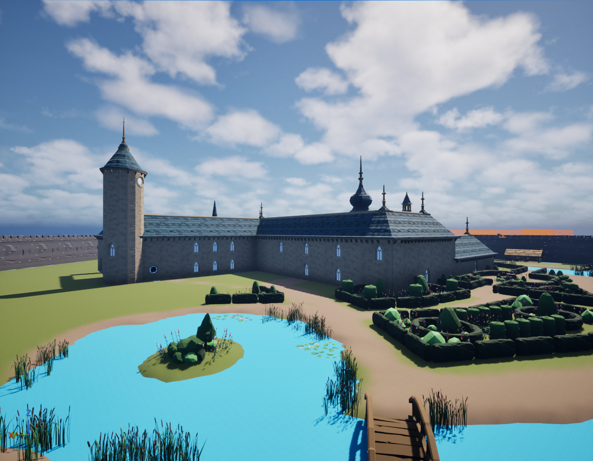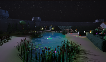 Then, I started working on other types of foliage. I added reeds, lily pads, bushes, and trees. My goal was to break up the flat terrain and make the environment look more lively. I decorated a cute little island in the middle of a small pond. Outside the perimeter walls, I added canal assets we had to the moat, so that it was no longer an odd hole in the ground. I also added many more trees all around the perimeter wall to fill the space out and discourage the player from going anywhere they were not supposed to.