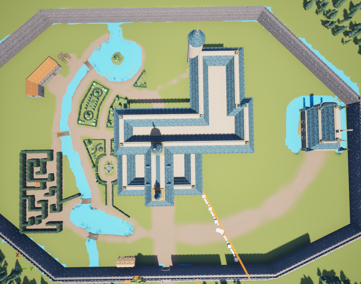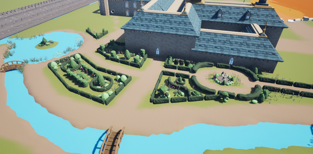 My name is Kyra, and I was the art team member in charge of building the garden levels. Riley, the design team member who worked on the garden with me, gave me a rough block out of the castle’s exterior. I got to work replacing the white boxes with assets and making it look pretty. The first thing I worked on was the hedge maze. I added in the proper assets and filled in the blank spaces with fancier hedges and flowers. This took a decent amount of time.