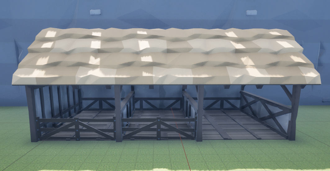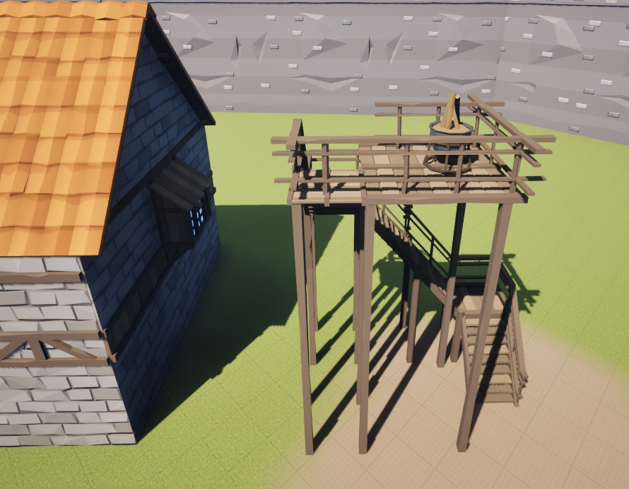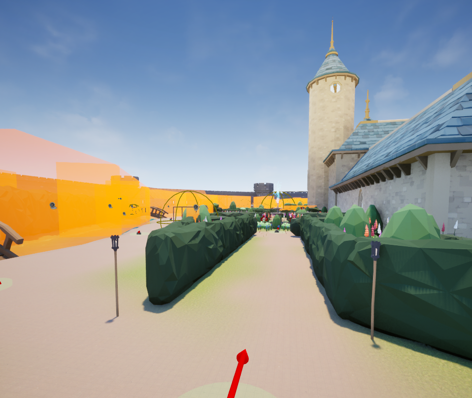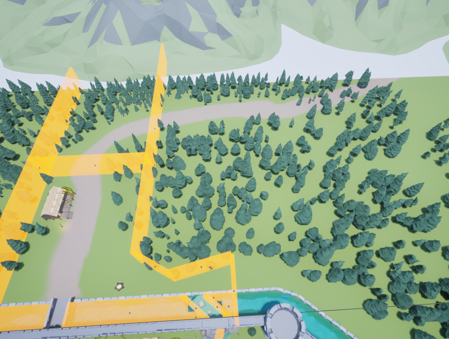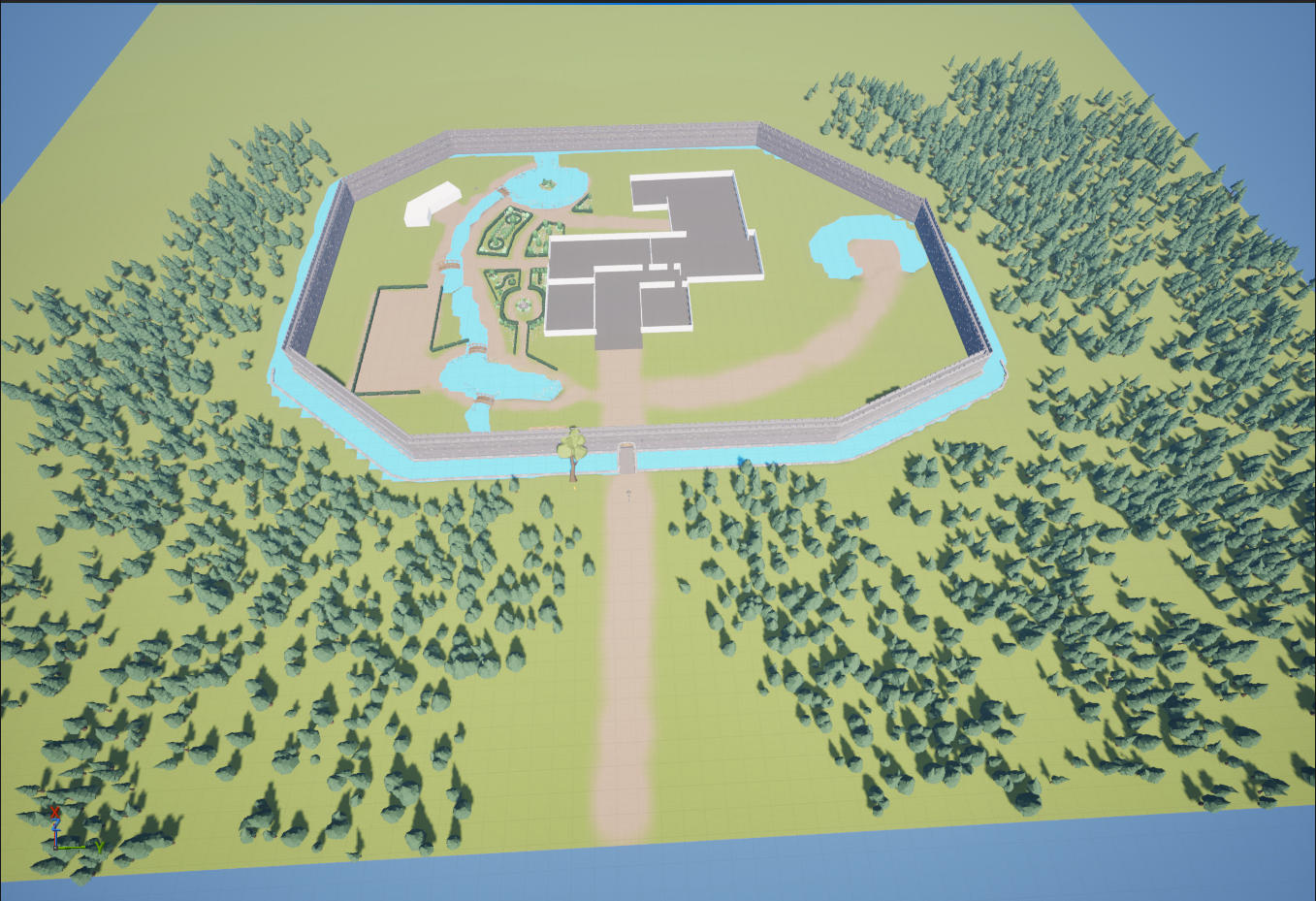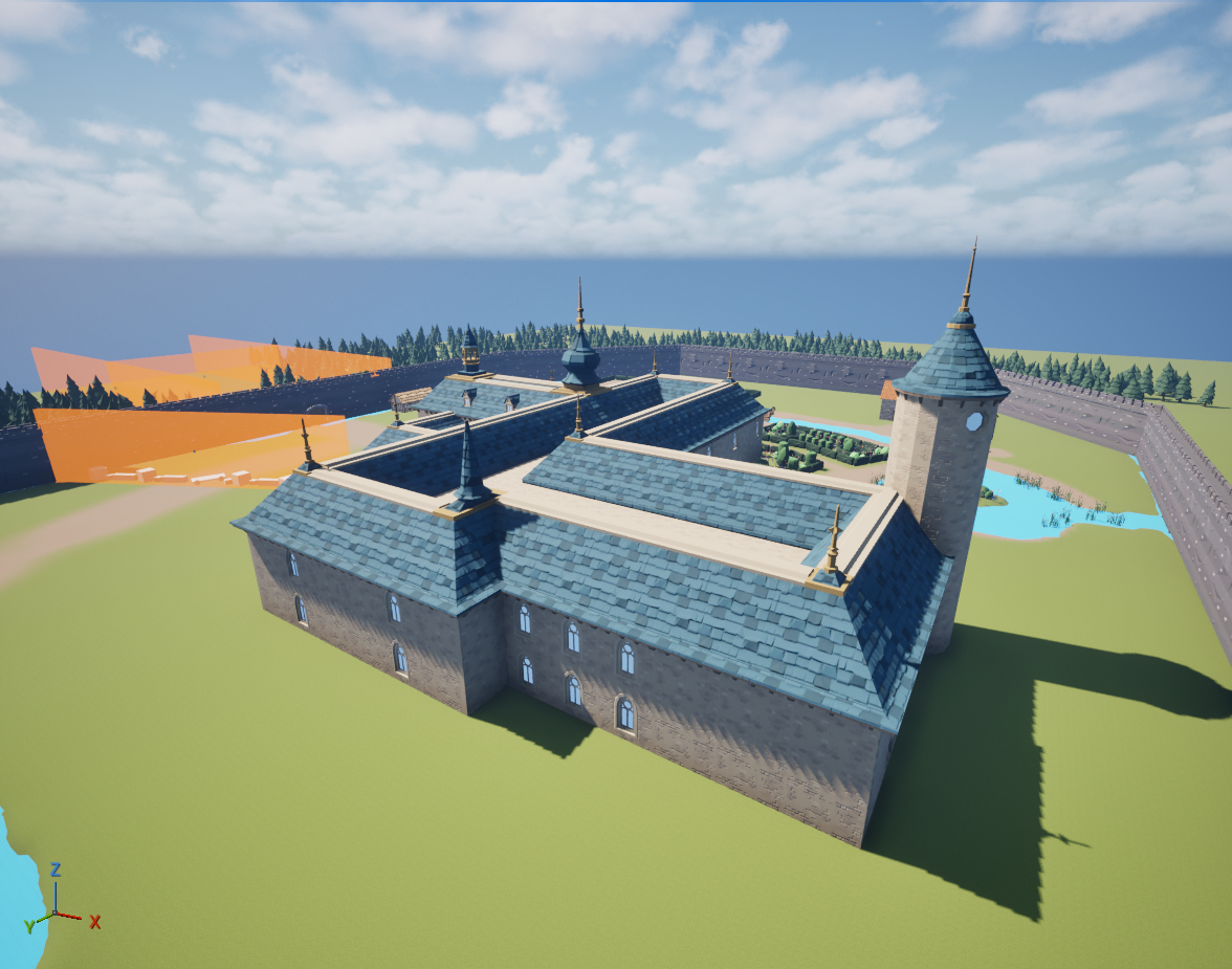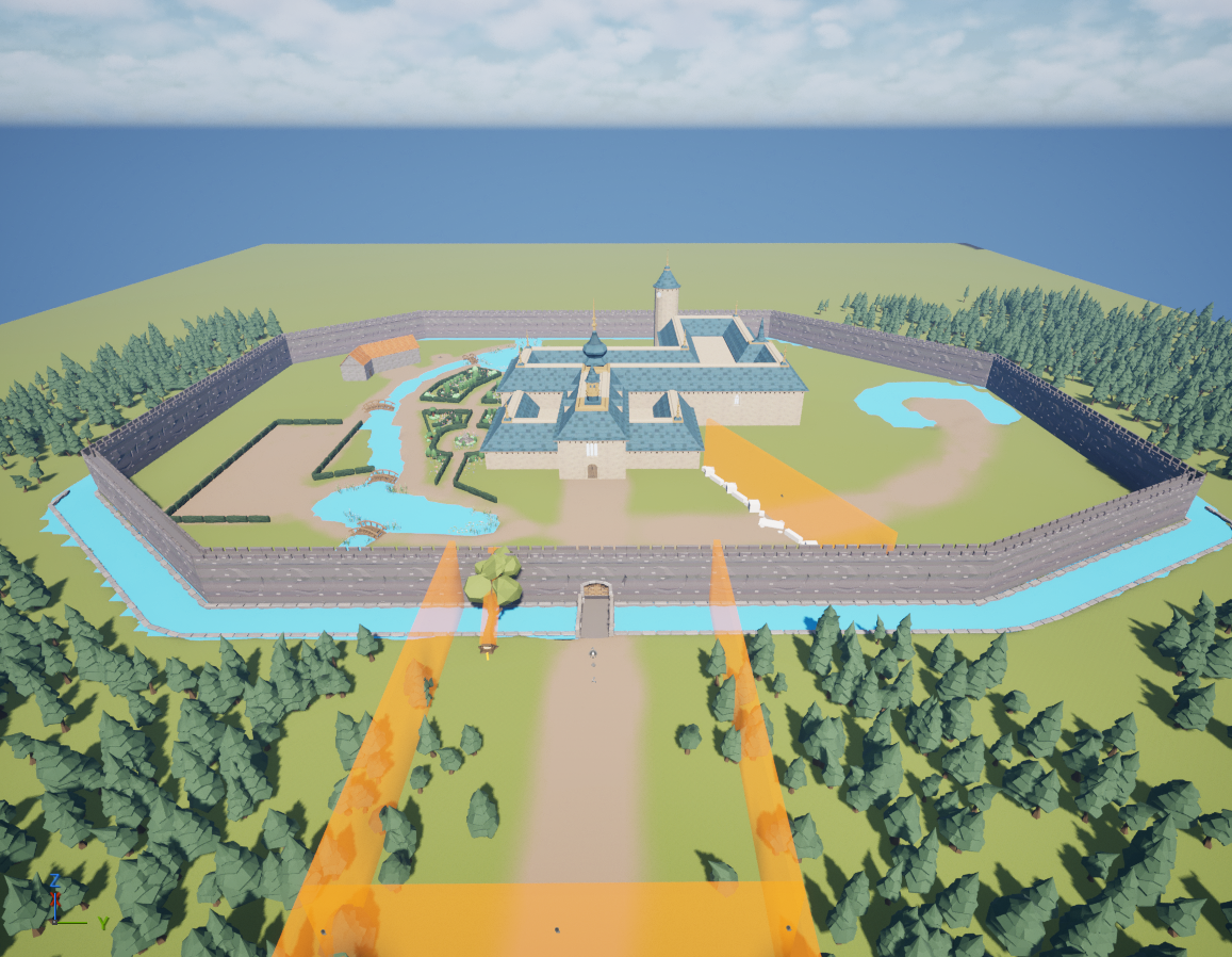 Next, I replaced the bridge and perimeter wall white boxes with their proper assets and added a nice front gate. I flattened a tree to act as the path on top of the perimeter wall. I tried very hard to get the tree to be walkable with its default collision. It was too finicky, and Riley later replaced that collision with a flat box.