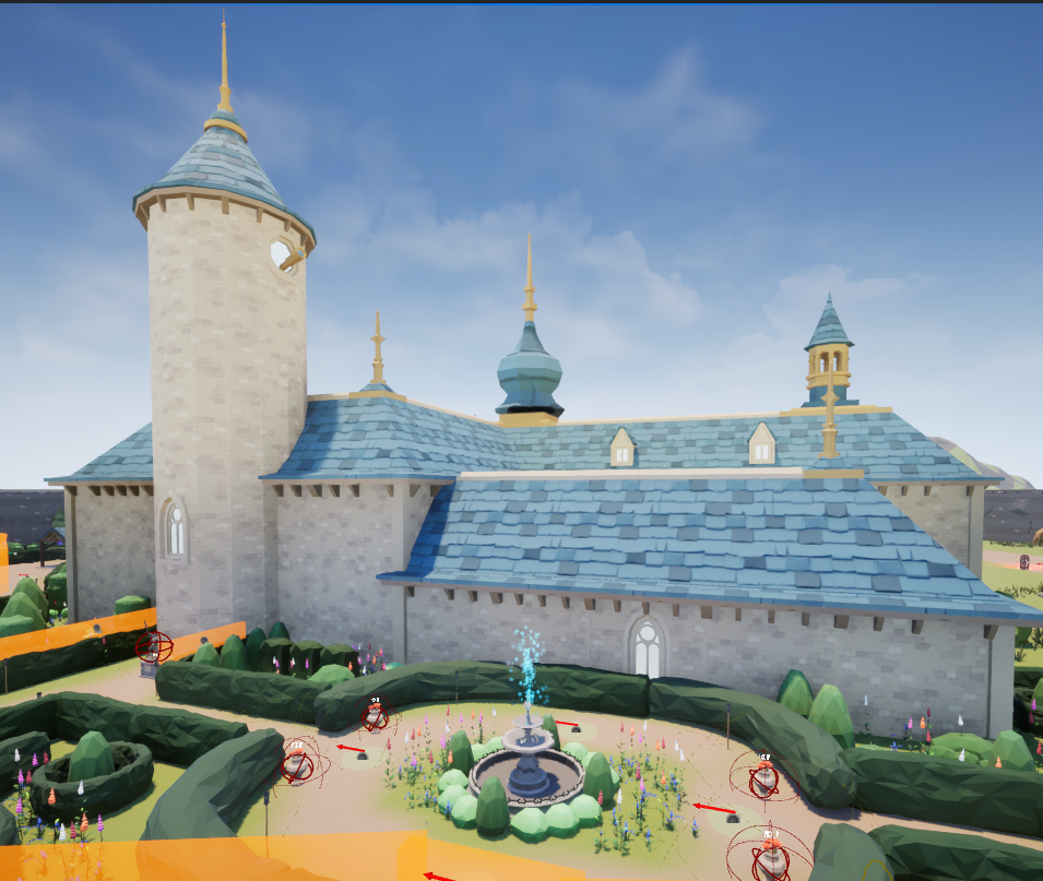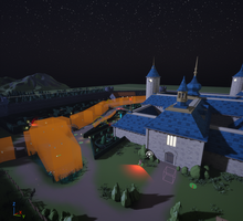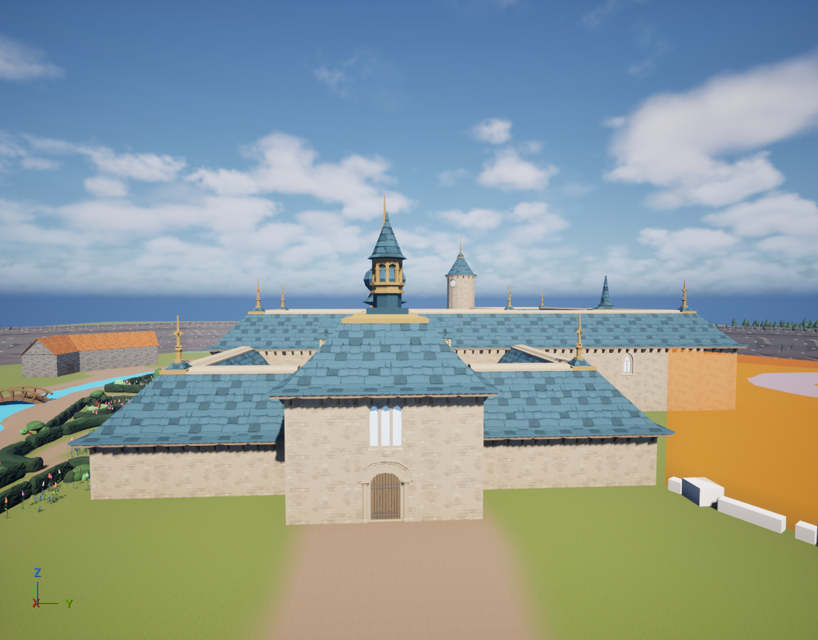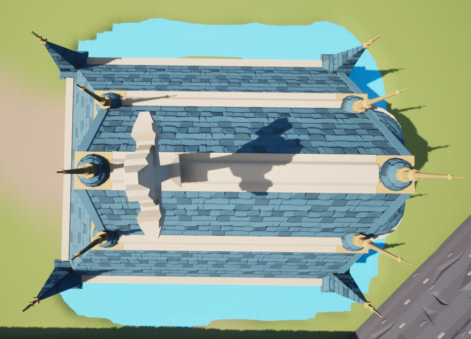 Unfortunately, it was then time to make the castle itself. I followed the maps Jacklynn had made as closely as possible and spent a full day, 8 hours, piecing castle assets together. The windows were transparent, allowing the player to see the barren land inside the castle, so I had to make a new glass material that was opaque. After I had the walls and windows where I needed them, I had to place about 5 layers of roof assets: the flat ceiling, the blue shingles, the overhanging shingles, the white caps, and the ornate end caps. The roof took a very, very long time, but at least I was done. Except I was not.