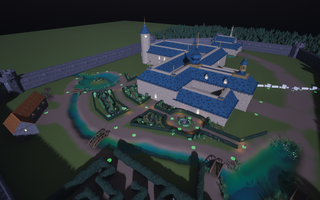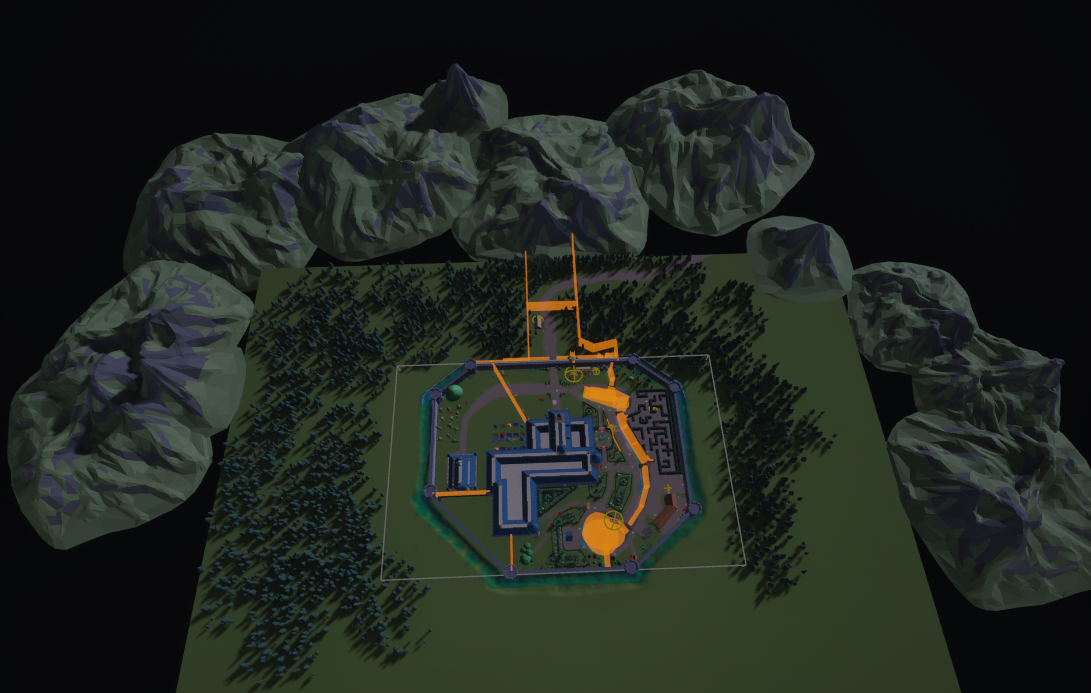 The garden had far too much open space, so I shrank in the perimeter walls. I added more decorative hedges throughout the left half of the garden. I added some larger trees to shake things up as well. Riley extended the hedge maze, added a small gazebo, a shooting range, and a reading nook behind the castle. I then adjusted the lights to accommodate a nighttime setting.