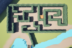 I took a screenshot of the empty area designated for the hedge maze and made Riley draw a maze in it for me. Then, I copied it into the game. It was too easy for the player to look above the maze and cheat, so I made the hedges thicker and taller.