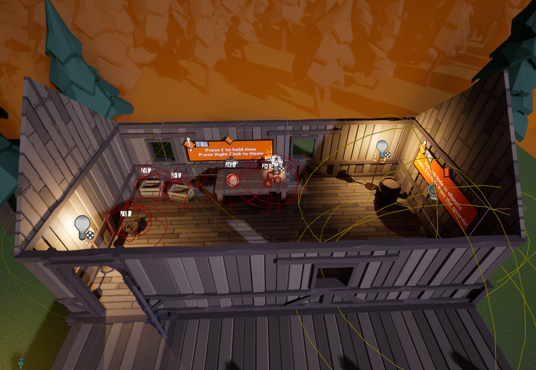 I also made a wayfinding torch that was more orange than the regular torches to help guide the player through the level. I made a sparkle VFX to highlight interactable items. I adjusted the color of the guard’s glowing vision eyes so they looked like torch lights, not red death lasers. I implemented as much player feedback as I could and gave feedback and advice for the lighting of other levels.