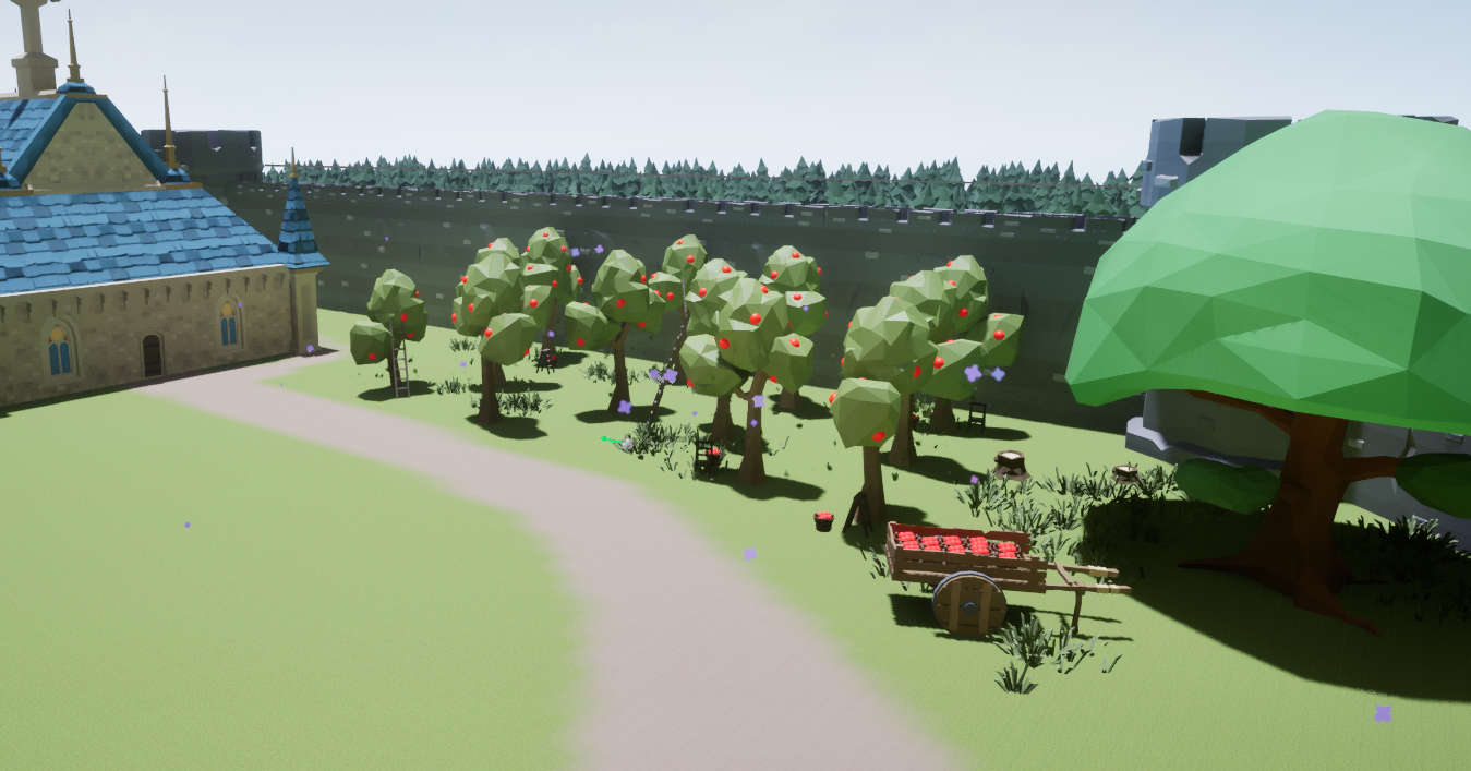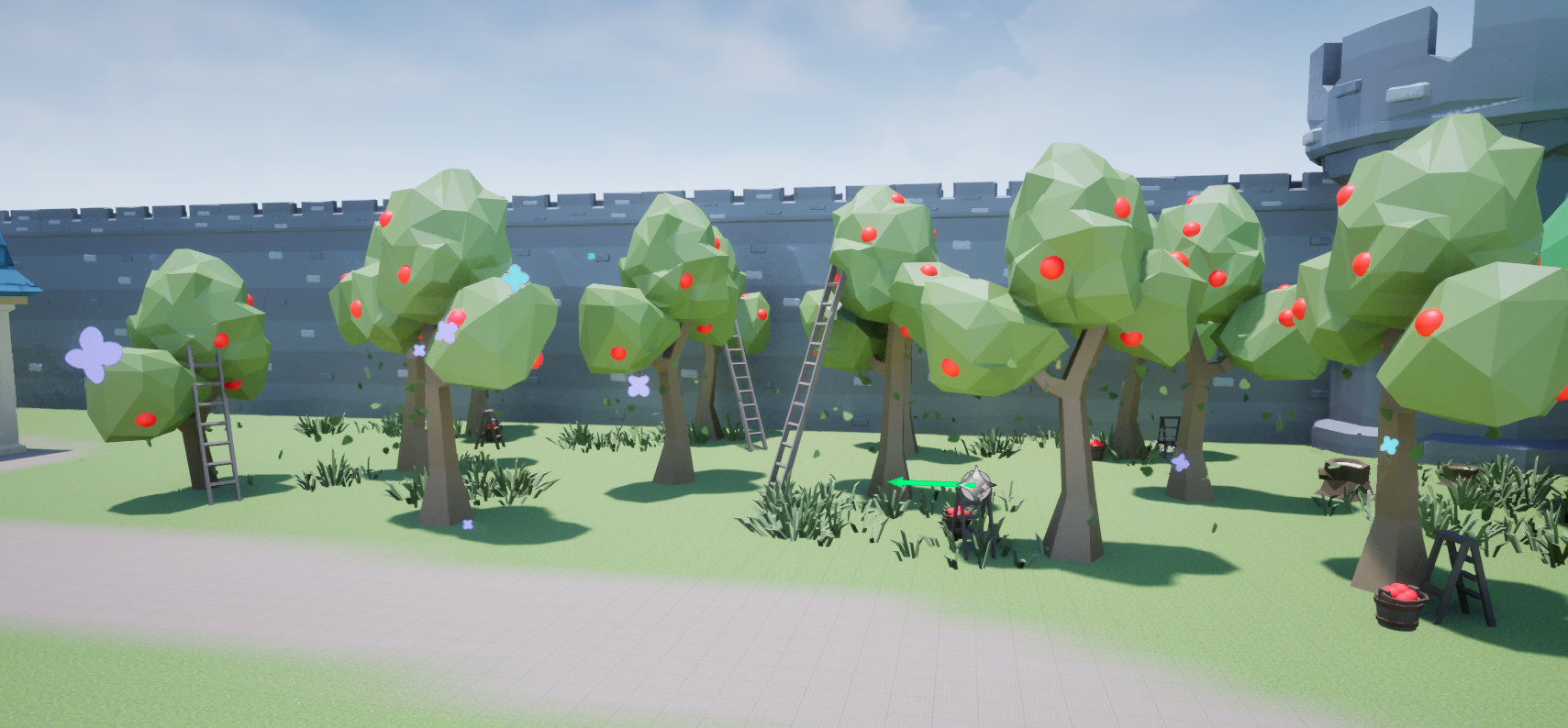 I duplicated the level and created a daytime lighting setup. Then, I made VFX leaves, fireflies, and butterflies to float about their respective levels. I optimized the lighting for the torches I’d strewn about the level and replaced the glowing windows with non-emissive blue windows in the daytime version of the level.