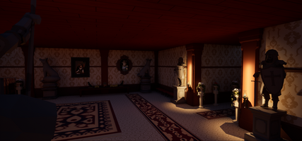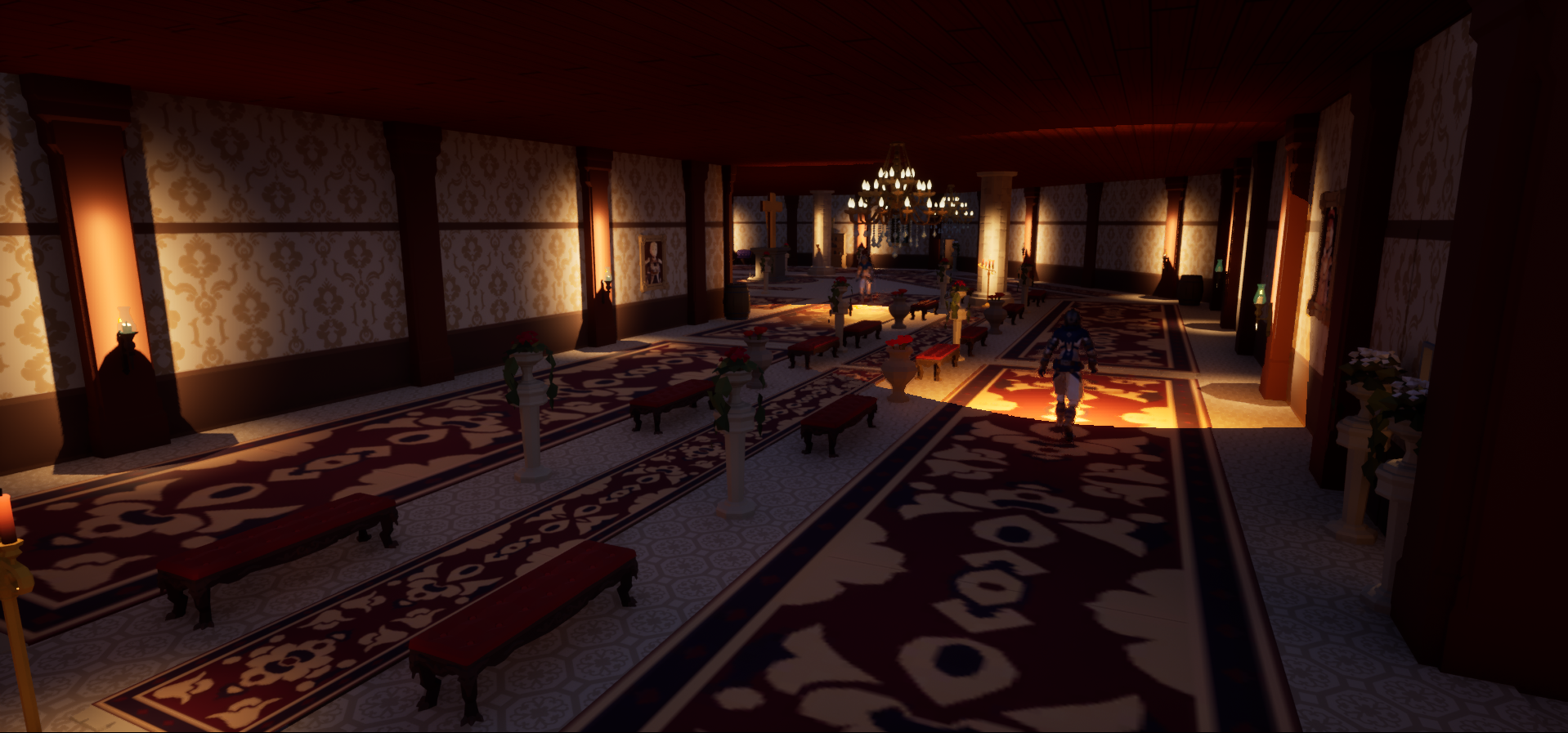 The last few responsibilities with the project was reworking my level to make each room more distinct by adding more props, changing the props that I used for each room, changed the wallpaper within the king and queens quarters. Also spent time changing the lighting to work well with the different quality settings of Unreal Engine, creating a night time feeling to my level while also being able to see clearly where guards are and allowing for the lights to illuminate the walls and props. I also worked on changing the video game poster that I created for playtesting, to be more of a regular poster with little to no text, and some graphic design.