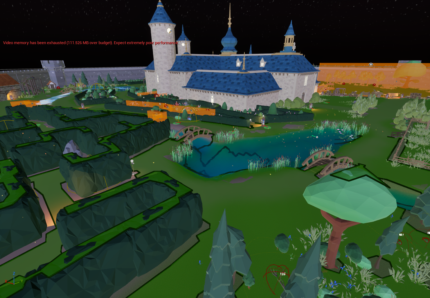My first and most major task was the make the garden level with my wonderful artist Kyra. Our main goal was to make a level that had a perfect balance of look vs feel, which we tried our best to achieve. It started with me making a basic block out of the castle (which would eventually turn into me making the block out for the Castle's First Floor) and additionally blocking the rest of the garden to hand over to Kyra. From there it became a game of push and pull, back and fourth between me and Kyra of adding in this that made the level feel good within our game and additional making it look as good as it feels to be in. I add the guard blueprint , provided by our coding team then Kyra add more detail to the area in which the patrol, so on and so until we came to what we have now. While I think we found a good balance of both, the level does suffer in its navigation. It is easy for the player to get lost. Overall, I think we did a great job for a level designed to be both a tutorial and a pseudo-overworld.