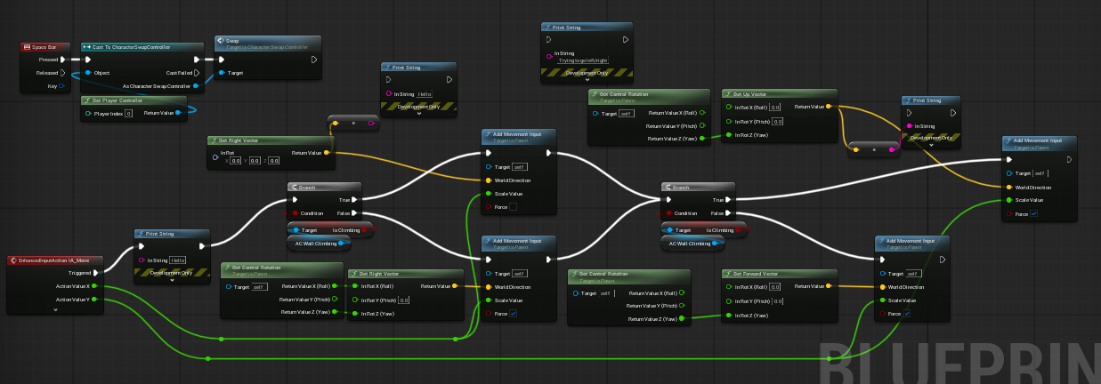 Working on Character Wall Climbing as well as turning the player character into a new player character that will allow the player to be able to climb walls. (currently I believe that the Sandbox Character movement may be interfering with the movement code of the character I added). Added a whole new character to work on and it is currently not moving (enhanced inputs are not being read). Moved all the code from the AC_WallClimbing into both characters I am currently working on.
