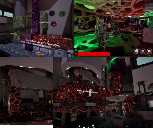 I worked on the grapple wall climb and the guts material, these are designed to cover large areas of space without repeating. To do this I set them as 4096 virtual textures so they don't take much memory, since most of our assets use the same texture anyway this should be pretty cheap. They use nanite displacement to give character to the environment and that also takes care of blending between different materials