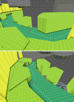 I’ve placed enemies in a separate blockout map and began testing on spline placement and movements. In the top and middle image, the player has just obtained the grapple as well as the ability to stealth eliminate enemies. The patrol routes shown are meant to provide the player with a choice: eliminate the enemies using their newfound skill, or bypass them entirely using the walkway above.