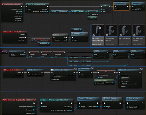 This week I added in pickups that unlocked the player’s special abilities. I also included a debug testing item that reverts the player back to a state where they don’t have any abilities unlocked. Then I made a health pickup with an instance editable amount of healing (we’ll need to playtest and talk with the design team about an appropriate amount of health for the player to retrieve). I also fixed an issue where the pause function was spawning the HUD instead of the pause menu and tested the options menu inside the pause screen to make sure it worked properly. I think I did something else as well, but my memory is failing me. Going forward we’ll need to talk with the art team about assets for the unlockables.