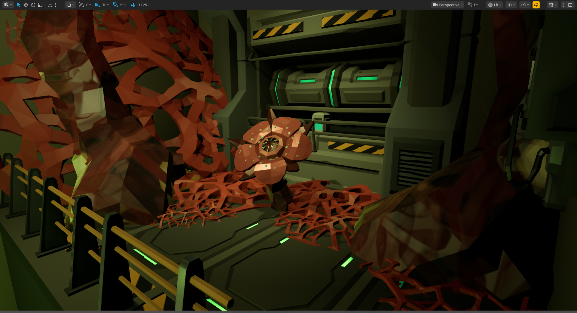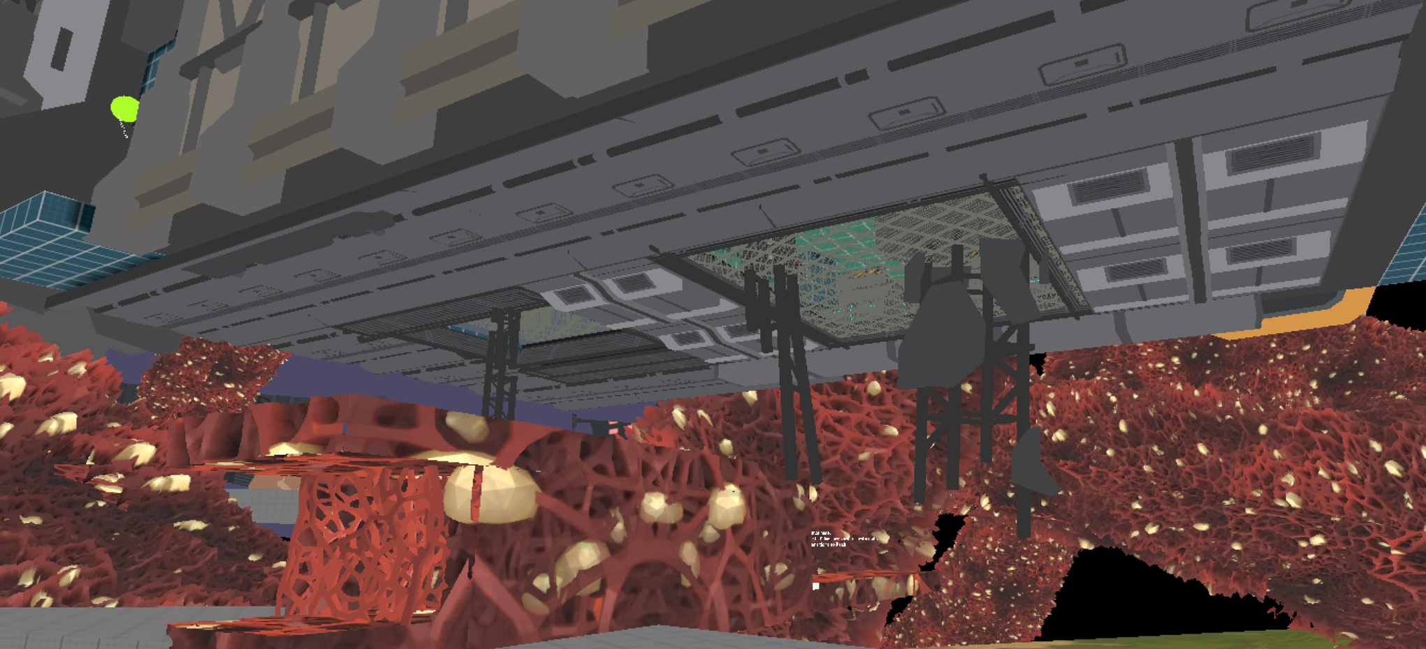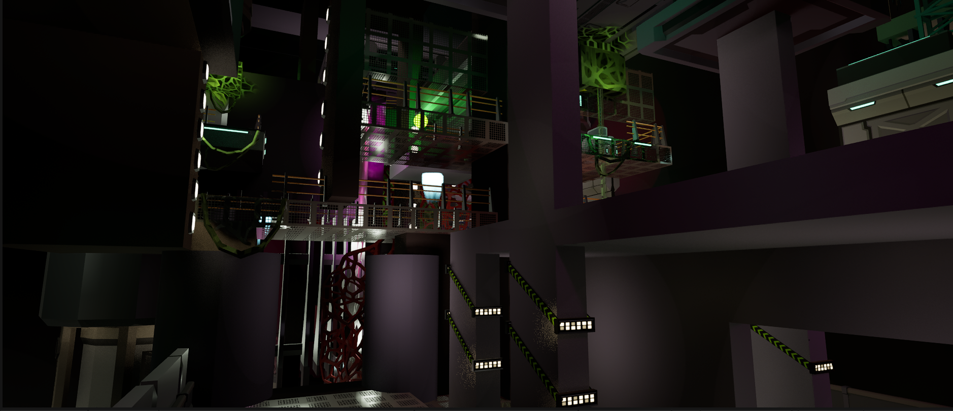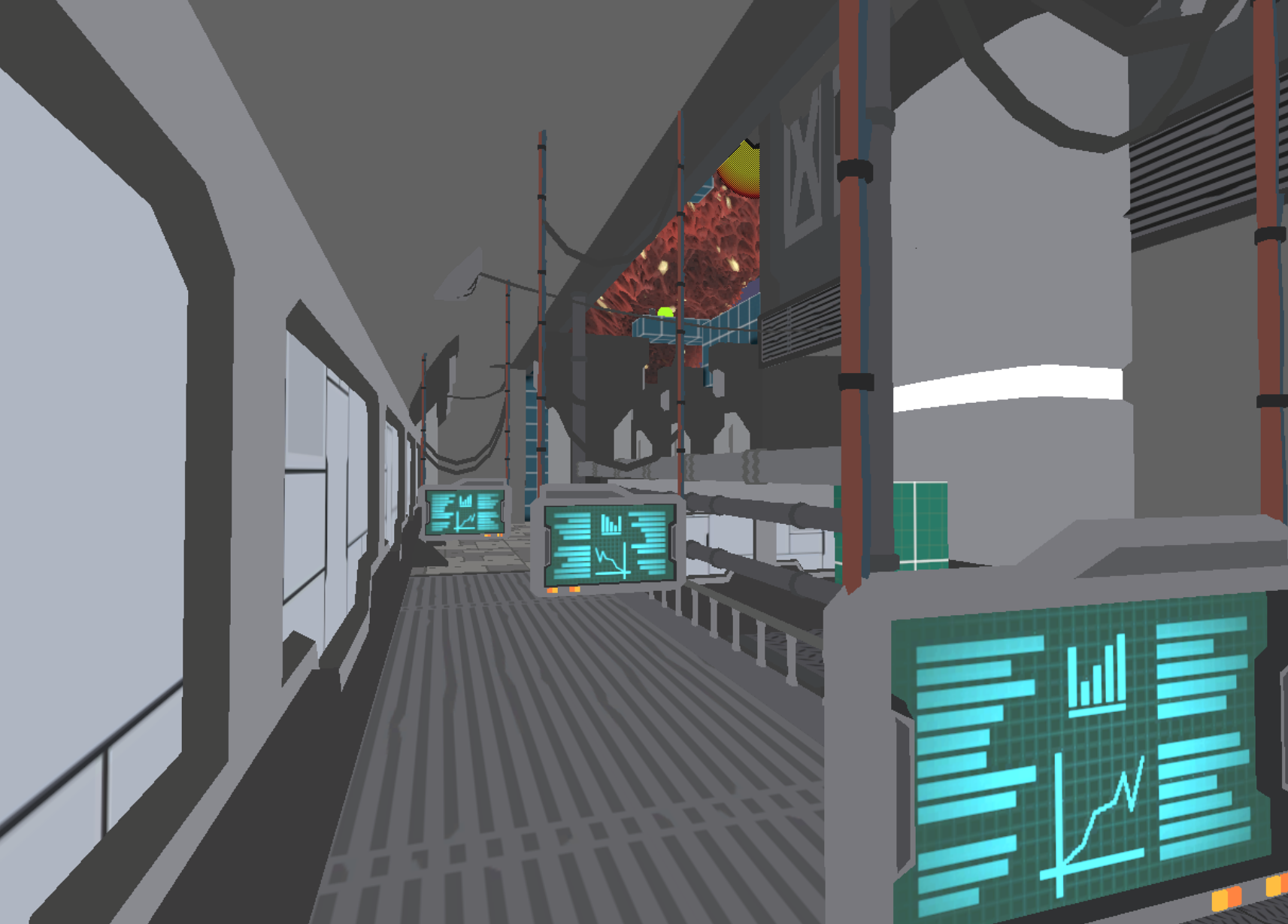 The art team has completed the art pass of the main level of Parasite Zero.  We are now working on the set dressing pass of the boss arena! Once we are finished with this, we will do a quick lighting pass and then go back and forth between the main and boss level to do a VFX pass—as well as fixing any set dressing issues found while playtesting.