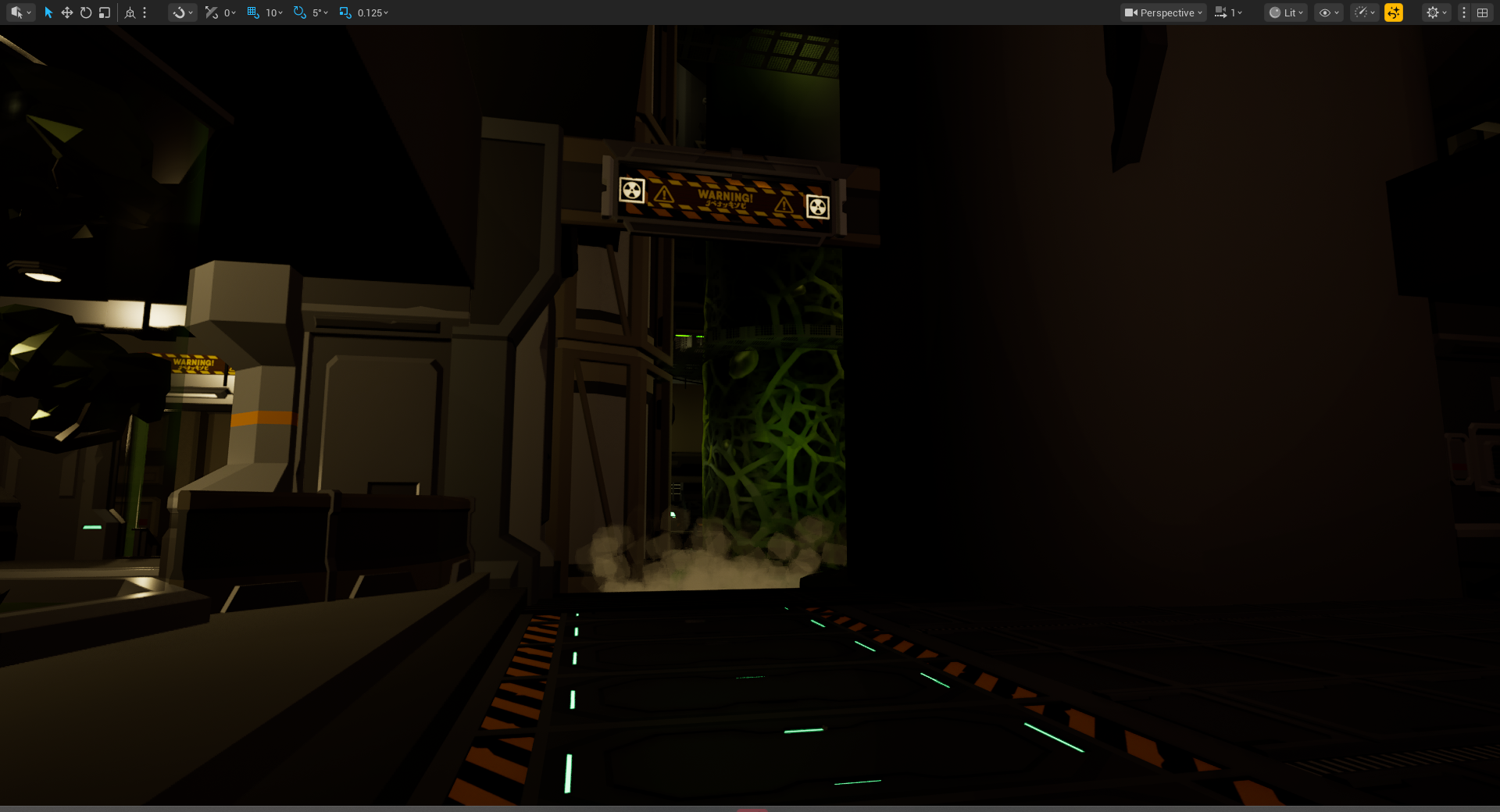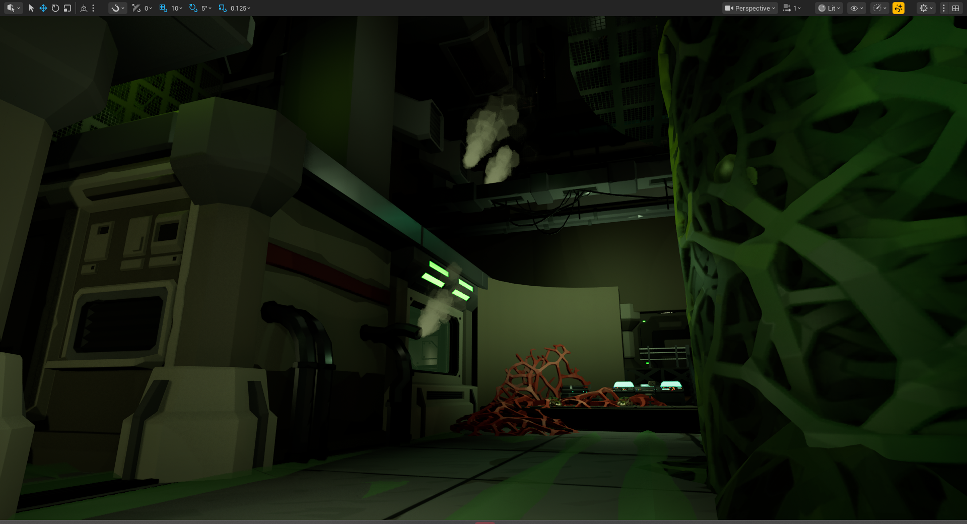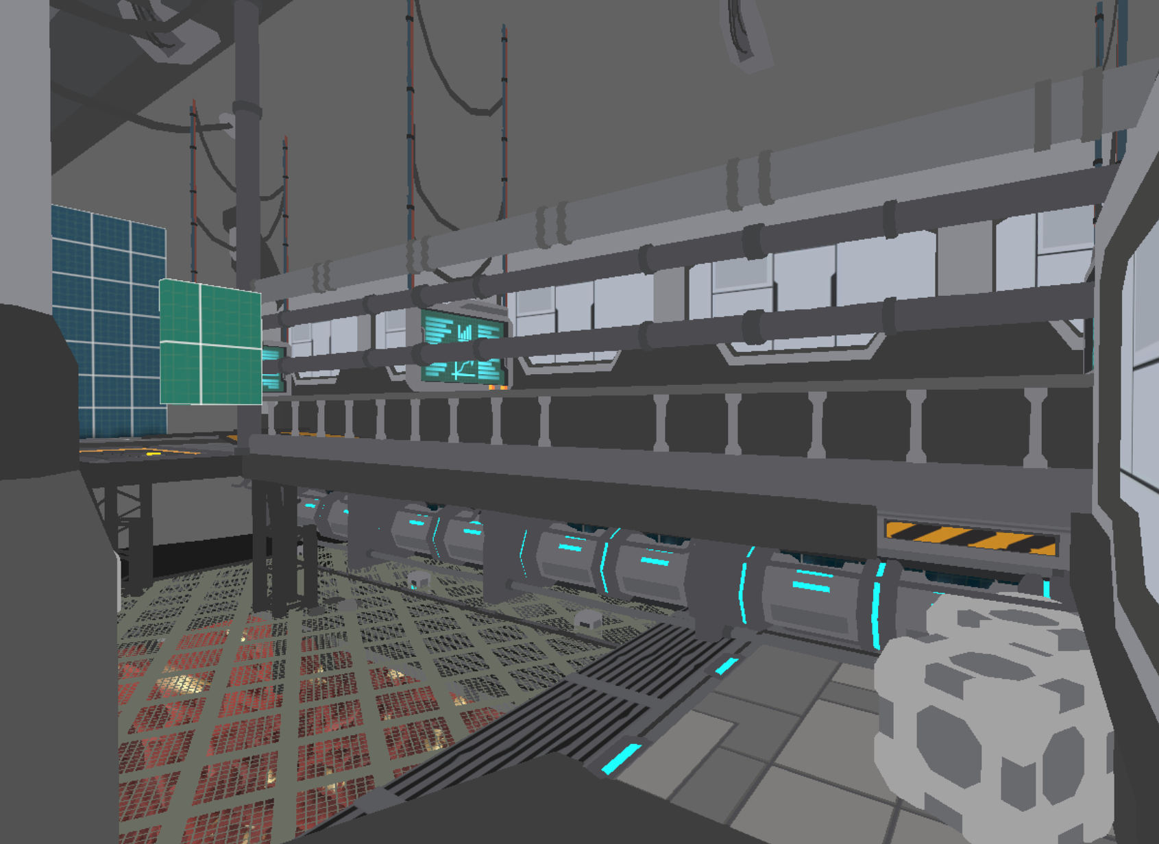 The art team has completed the art pass of the main level of Parasite Zero.  We are now working on the set dressing pass of the boss arena! Once we are finished with this, we will do a quick lighting pass and then go back and forth between the main and boss level to do a VFX pass—as well as fixing any set dressing issues found while playtesting.