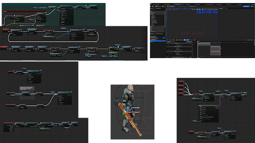 Death widget and death sequence. Added a global time dilation to smoothly blend out of the death into ui, fade black on death, also worked on a bit of the widget animation. Fixed a weapon bug on the shotgun, made the shotgun stay out longer when shooting, removed debug notifications and traces from weapons, and visual effects for the shotgun( flash to gun barrel), and added sound cue to gunshot. Fixed shotgun location during shooting. Fixed an input bug when right clicking the screen zooms and shoots shotgun (removed zoom) Fixed bug with the Kill floor respawn. Started on the tutorial popups Added a collision box to trigger the tutorial, added a widget to the project, fades into the widget with animation, and it pauses the game.